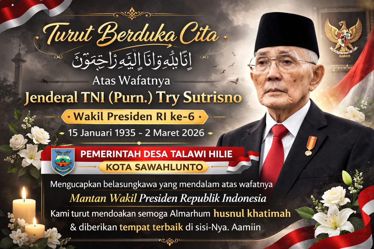 Baca Selengkapnya: Kabar Duka: Wakil Presiden ke-6 RI Try Sutrisno Meninggal DuniaTalawi Hilie, 02 Maret 2026 – Indonesia kembali berduka atas berpulangnya Jenderal TNI (Purn) H. Try Sutrisno, yang pernah menjabat sebagai Wakil Presiden Republik Indonesia periode 1993-1998. Beliau meninggal…