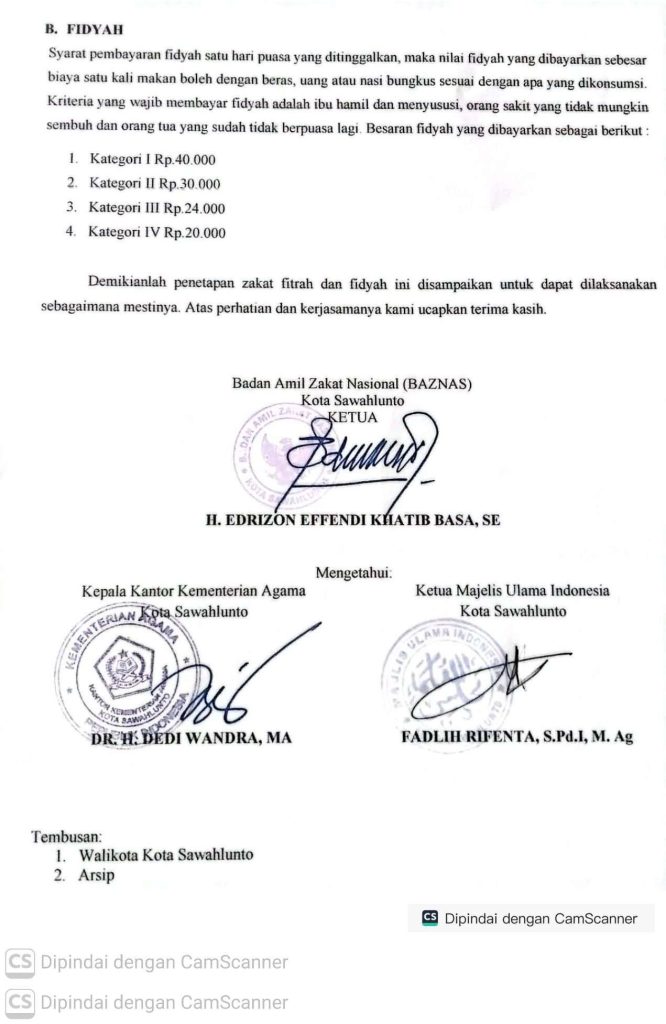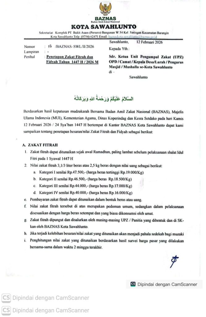 Talawi Hilie, 26 Februari 2026 – Badan Amil Zakat Nasional (BAZNAS) Kota Sawahlunto resmi menetapkan besaran Zakat Fitrah dan Fidyah untuk Tahun 1447 Hijriah / 2026 Masehi. Penetapan ini tertuang dalam Surat Nomor 18/BAZNAS-SWL/II/2026 tertanggal 12 Februari 2026.