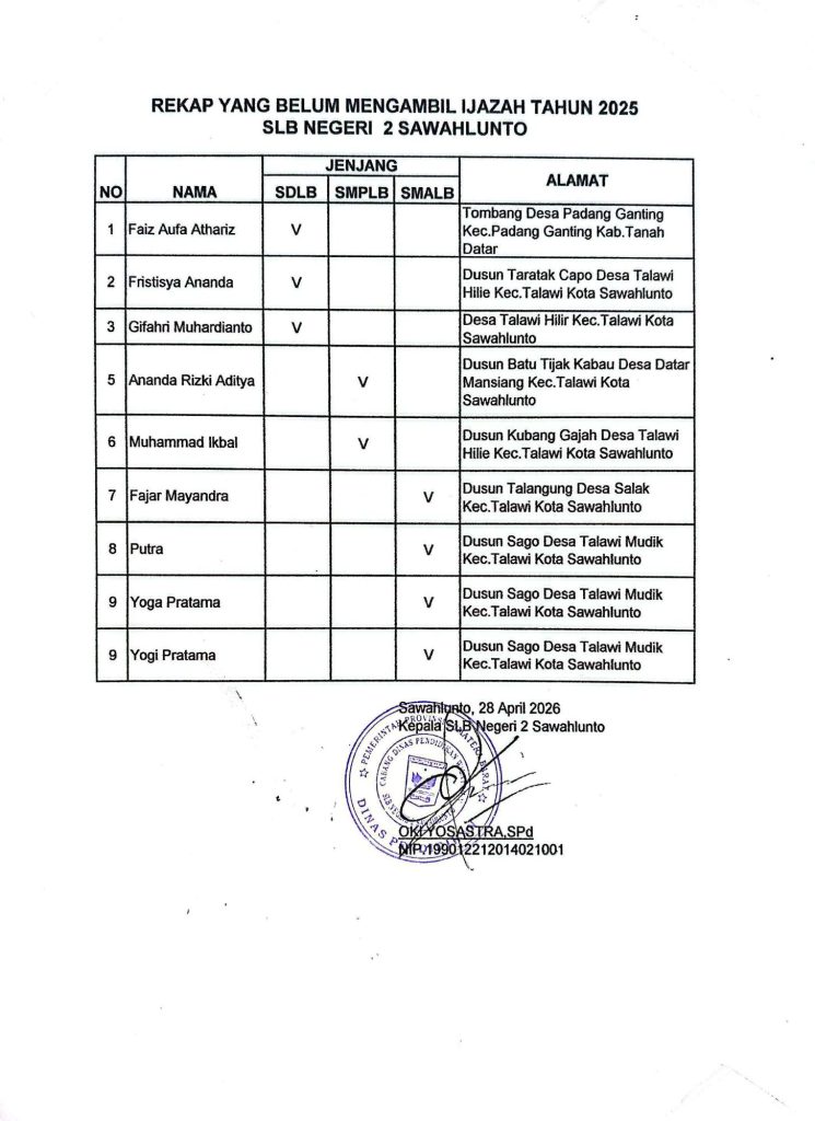 Talawi Hilie, 28 April 2026 – Pemerintah Desa Talawi Hilie menerima himbauan dari beberapa sekolah terkait pengambilan ijazah bagi para alumni yang hingga saat ini belum mengambil ijazah aslinya. Himbauan tersebut berasal dari SMK Negeri 1 Sawahlunto dan SLB Negeri 2 Sawahlunto.