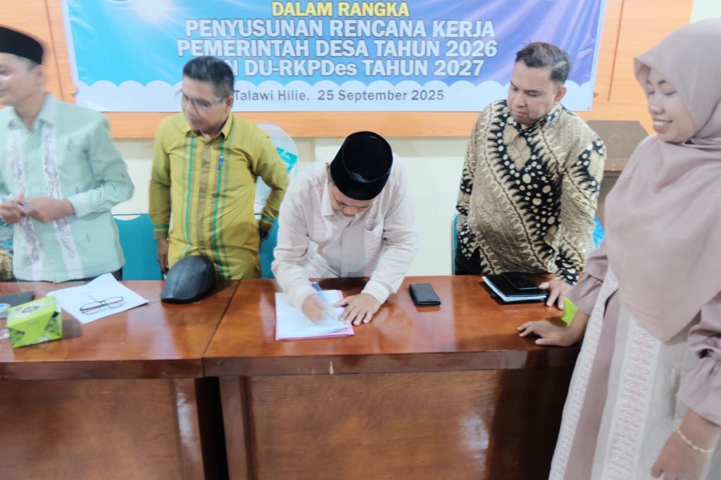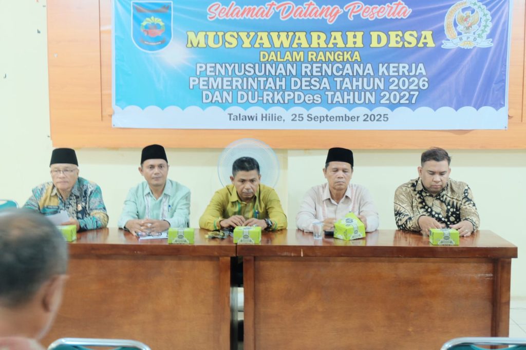 Talawi Hilie, 26 September 2025 — Pemerintah Desa Talawi Hilie melaksanakan Musyawarah Desa (Musdes) Penyusunan Rencana Kerja Pemerintah Desa (RKPDesa) Tahun 2026 dan Daftar Usulan Rencana Kerja Pemerintah Daerah (DU RKPD) Tahun 2027 pada Kamis siang di Ruang Rapat Kantor Desa.