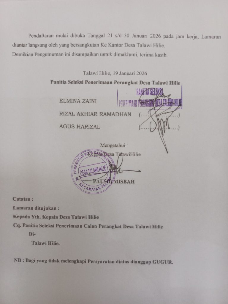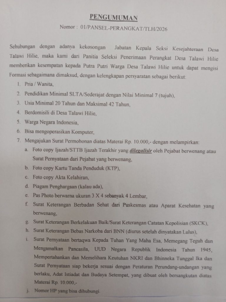 Talawi Hilie, 23 Januari 2026 – Pemerintah Desa Talawi Hilie secara resmi membuka pendaftaran penerimaan Perangkat Desa baru untuk jabatan Kepala Seksi Kesejahteraan. Pendaftaran ini dibuka sebagai upaya pemenuhan kebutuhan aparatur desa dalam mendukung penyelenggaraan pemerintahan desa serta peningkatan pelayanan kepada masyarakat.